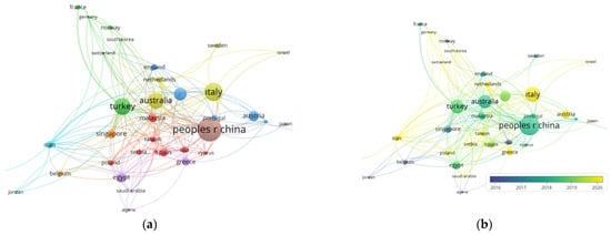 The citation analyses made to the countries that covered the research topic are shown in Figure 14. To provide more detailed data before the analysis is performed in VOSviewer, the minimum number of documents and citations of a country was limited to two. While it is seen that the 322 documents reached after the screening were prepared in partnership with 58 countries, this was reduced to 39 countries after the limitation. However, when the connections between the countries were analyzed, it was seen that the citation networks of 37 countries interacted with each other. The countries with the most publications are Italy (45), China (35) and Turkey (28), respectively (Figure 10). It was found the first three countries that received the most citations did not change over time and received 307, 481 and 270 citations, respectively. In addition, another point that draws attention in the country citation analysis is that Austria received 122 citations with three articles and Singapore received 90 citations with five articles. It is seen that research publications in these two countries have an important position in the issue’s sensitivity.