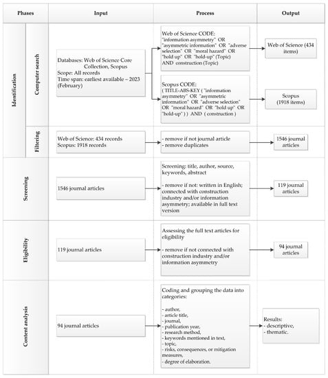 In the first phase, named identification, a comprehensive exploratory desktop search was performed. The computer search was conducted on two large databases of scientific literature, namely “Web of Science Core Collection” and “Scopus”. The time span which these databases cover is very extensive and was searched in its entirety. The Web of Science Core Collection database contains records from 1955, and Scopus also covers research published before 1960. The computer search included the keywords “information asymmetry”, “asymmetric information”, “adverse selection”, “moral hazard”, “hold-up” and “construction”. They were jointly searched for in the paper titles, keywords and abstracts. After the computer search of two databases, the records were joined in the reference management software Mendeley. All the subsequent phases were conducted in Mendeley, which enabled the objectivity of the analysis and careful management of retrieved records [37]. In the sub-phase filtering, with the help of Mendeley and reading of the records’ titles, all the duplicates and papers which were not published in scientific journals were removed. Through phase 1, a total of 1546 journal articles were collected. To avoid subjectivity, the subsequent phases were conducted in two stages by two researchers. First, one researcher performed the screening, eligibility assessment and content analysis. Second, the other researcher carefully reviewed the whole process. There were not any disagreements because they were mitigated with regular discussions between the two researchers and continuous cooperation using the software Mendeley.