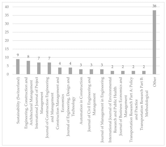 According to the leading journals’ analyses (Section 3.1.1), the topic is predominantly applied in the fields of project management and construction management. With Sustainability being the leading journal (see Figure 2), it seems that the topic of information asymmetry can affect the sustainable development of construction projects. Previous research considered the impact of information asymmetry on the environmental needs of the community as an important stakeholder of construction projects [16]. Also, there is a development in firms reporting their environmental, social and governance (ESG) performance to reduce information asymmetry between them and consumers [17]. Nevertheless, this idea needs further development since only nine articles were found in this field.