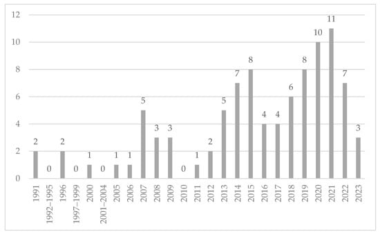 The year-wise distribution of 94 retrieved articles is shown in Figure 3. Before 1991, there was no mention of information asymmetry or associated terms in articles dealing with construction projects. Information asymmetry appeared in scientific research in the 1970s (see [8]) in the field of behavioral economics. It was part of the New Institutional Economy approach, which significantly changed how the field viewed the market. So, according to this literature review, the term did not appear in construction research until 20 years later, when the first two articles were published by Rosenfeld and Geltner [43] and Ward et al. [44]. Both studies were conceptual. The topics that were studied included the incentive contracts between the client and the contractor [43] and the risk attitude of contractors with implications on adverse selection and moral hazard [44]. In the 1990s, only two more articles dealt with the consequences of information asymmetry on technological development in the case of large construction projects [45,46]. In the period from 2000 to 2010, 14 more articles were published, but only after 2011 would the real development of the research in question start. In the following 12 years, a considerable number of 76 articles were published, with a significant enrichment of the topic.