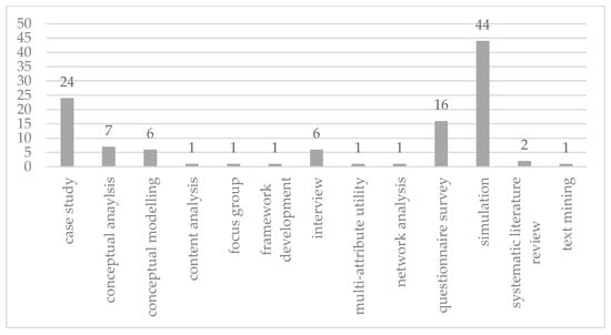 Figure 4 shows the frequency of research methods used in retrieved studies. Researchers used 13 different methods in their studies. Both quantitative and qualitative methods (in approximately 50-50 ratio) were used. Of the 94 retrieved articles, 19 studies used multiple methods. In most cases, it was a combination of the quantitative and qualitative approaches (the so-called mixed-method approach). The most common method used is simulation. It is applied in 44 different studies. The simulation method includes the development of a mathematical model of some real phenomenon and a simulation of scenarios that could happen in nature, which is usually advocated by computers. In retrieved articles, agent-based models are prevailing, with game theory being the most common underlying approach. The method is especially appropriate for research on information asymmetry because of the theoretical foundations in principal–agent theory and the possibility of considering the principal–agent relationship through agent-based models. The second most common method used in retrieved articles is case study research. Case studies are used in 24 different articles. This body of literature provides a better understanding of the topic through real-world examples of information asymmetry in construction projects. Other popular methods include questionnaire surveys and interviews and conceptual analysis and modelling. Questionnaire surveys and interviews involve opinions from construction project participants. Furthermore, the aim of conceptual analysis and modelling is to better understand the terms and repercussions of information asymmetry between the construction project participants. It is worth noting that conceptual research is equally used in earlier and later years of the topic development, independently or in combination with other methods.