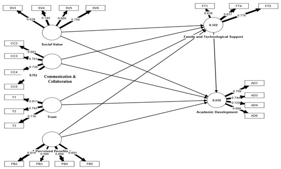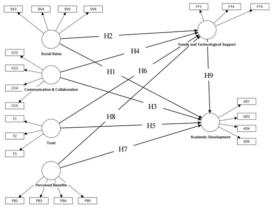 According to this theoretical framework, the combined influence of social value, communication and collaboration, trust, and perceived benefits will impact students’ academic development. These independent variables play a significant role in shaping the learner’s growth. Furthermore, the relationship between these variables and academic development is mediated by the support provided by family and technology. Family assistance and technological resources act as intermediaries, facilitating the impact of the independent variables on students’ academic progress.