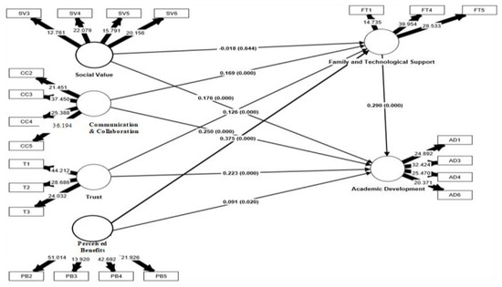 According to Gao and Bai (2014) [59], peer, family, and media social influence (SI) have a significant impact on individuals’ inclination to adopt specific technologies. SI refers to the extent to which individuals believe that significant others endorse using a new system. Rahman et al. (2018) [15] and Venkatesh et al. (2003) [60] supported the notion of SI as a crucial factor in technology adoption. Schmidthuber et al. (2020) [61] found a positive relationship between societal impact and customers’ intentions to use mobile payments. However, in this study, family and technological support were considered influences from the family that encouraged greater utilization of social media for knowledge sharing and subsequent academic development. Family and technological issues can mediate the relationship between perceived ease of use and students’ academic development. Students with access to reliable technology and Internet connections are more likely to share knowledge on social media platforms. Support from the family, such as parental monitoring and financial assistance for social media use, can also positively influence students’ adoption of social media for educational purposes. These factors facilitate the ease of using social media and contribute to students’ academic development.