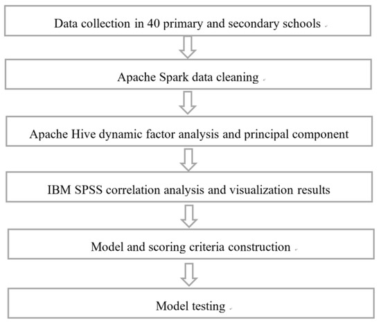 The research conducted analyzed the school management quality of 40 primary and secondary schools in Q Province in 2020 utilizing the evaluation methods and criteria for standardization of management in compulsory education outlined by the “Fujian Provincial Department of Education” [33]. A total of 1760 sample data points were collected through the evaluation. Using advanced big data technology from Apache Spark 3.2.1, data cleaning was performed on the sample data. Subsequently, dynamic factor analysis and principal component analysis were carried out using Apache Hive 3.1.2. IBM SPSS Statistics 26 was also utilized for correlation analysis and the visual display of results in order to construct a comprehensive school management quality evaluation model and corresponding scoring criteria for the compulsory education stage. These efforts sought to streamline the evaluation process and establish more efficient and accurate methods for assessing school management quality. Finally, the model was tested using expert evaluation data concerning these 40 primary and secondary schools in 2021. The detailed process is shown in Figure 1.