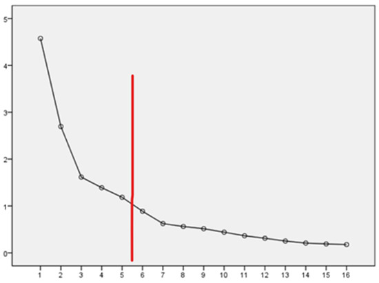 Dynamic factor analysis gravel map of 16 variables. Note: the x-axis is the fraction and the y-axis is the characteristic value.