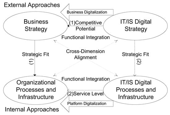 Enterprise digitalization refers to the application of digital technology and intelligent technology to the entire operation management and business process, as well as to the reliance on these technologies to improve research and development, production, sales, service, and other links. The aim is to promote the digitalization of the overall process of enterprise development enabling the enterprise value chain, the innovation chain and the supply chain [28]. With the rapid development of information technology, competition between enterprises is becoming increasingly fierce. Furthermore, the investment of enterprises in information technology increases year by year. Scholars have conducted research on strategic matching, and believe that the key through which enterprises can maintain their competitive advantages lies in their adaptation of their business plan (BP) and information systems planning (ISP) [29]. The most representative research is the strategic alignment model (SAM) proposed by Henderson and Venkatraman [30]. The theoretical framework of SAM includes four fields: business strategy, IT/IS strategy, organizational processes and infrastructure, and IT/IS processes and infrastructure. Three types of matching relationships are formed: the first two are BP-ISP relationships in terms of the external environment, describing the enterprise’s overall strategic planning in the face of market competition; the last two are the BP-ISP relationship in the internal environment, focusing on the specific management logic and structure design of the enterprise; and the cross-domain matching relationship, which reflects the matching of strategic planning and architectural processes [31]. In particular, four matching patterns are the most important and can better reflect the process of digital transformation. The first two matching paths are driven by business strategy, which can form the model of “strategy execution” and “technology potential”. The latter two paths are driven by IT/IS strategies, which can form “competitive potential” and “service level” models [32].