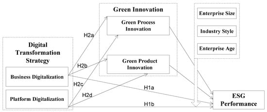 Based on the existing research, the impact of enterprise green innovation on regional carbon emissions has a double effect of positive or negative [61]. Scholars have divided the dimensions of green innovation based on different theoretical backgrounds and research perspectives. It is generally accepted that it can be divided into green process innovation and green product innovation [21,62,63]. Green process innovation involves changes or adjustments to manufacturing processes that help reduce negative environmental impacts at production stages such as material procurement, manufacturing, or delivery, including clean technologies and end-treatment [64]. Green product innovation is the design of products that use fewer resources, have a lower environmental impact and risk, and prevent waste from being generated at the conception stage in the first place [65]. This study analyzes the mediating role of green innovation in the above two dimensions. Specifically, enterprises can integrate digital technology into the original production process [66]. Digitalization can improve the ability of information sharing and processing within enterprises to facilitate cross-department cooperation and coordination, in order to promote the quality of green process innovation. Business digitalization can empower enterprise business practices, enhance business flexibility, adjust and optimize the existing process and architecture with the help of digital technology, and promote enterprise innovation [45]. At the same time, enterprises can use digital technology to optimize resource allocation and create new products with competitive advantages through combination with original products [67]. Business digitalization can integrate a green supply chain to facilitate upstream and downstream business processes [68]. It is conducive to green product innovation, which affects the enterprise ESG performance. In conclusion, green process innovation and green product innovation mediate the relationship between business digitalization and enterprise ESG performance, respectively. The following hypotheses are proposed: