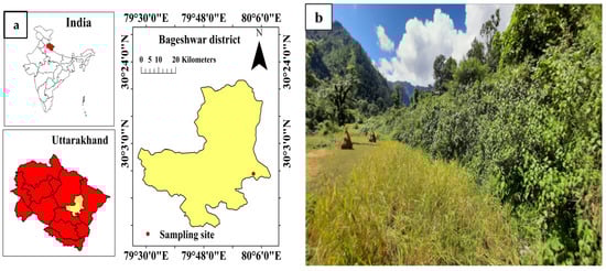 Agriculture and related activities play a significant role in the lives of the Himalayan economy. A majority of these activities are centred between 1200 and 2000 m above sea level (mid–hill zone), where agriculture and allied activities account for about 80% of the rural economy [1,2]. The region differs in terms of topography, cropping patterns, agricultural practices, and in many more ways. Traditional agricultural practices depend heavily on forest–derived resources (vegetative materials such as fodder and bedding leaves, and animal wastes) and are prominently subsistence–based without any commercial interest [2,3,4]. Production is meagre as the area under arable land is extremely limited and fragmented, with poor irrigation facilities [4]. Due to the low agricultural productivity and ecological difficulties in the region, traditional agriculture practices are gradually changing, and chemical fertilizer and pesticide application rates are rising [4,5,6]. Further, the introduction of invasive weeds caused by cropland damage as a result of climate change and rising global temperatures is contributing considerably to the already declining agricultural productivity [7]. The ingression of invasive weeds in and around croplands has emerged as a noticeable threat to the existing agricultural as well as natural biodiversity of the area, which in addition, are also promoting the establishment of other alien species over native species [8].