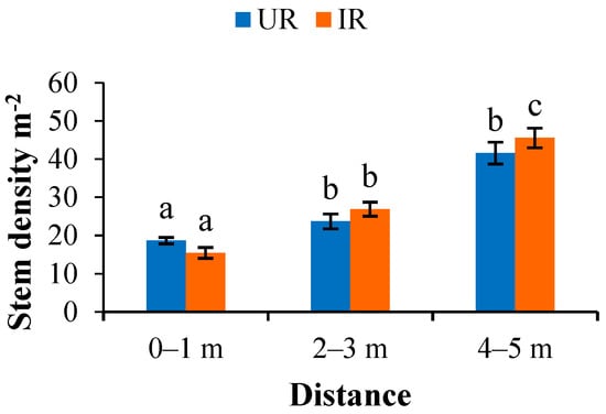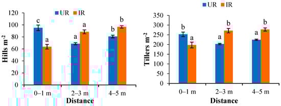 The planting density of both crops increased significantly with increasing distance from ridges in the order 0–1 m < 2–3 m < 4–5 m, with the lowest values recorded in IR fields. Rice tiller density in UR and IR fields ranged from 203 to 253 tillers m−2 and 198 to 278 tillers m−2, respectively; hill density ranged from 81 to 95 hills m−2 and 64 to 97 hills m−2, respectively (Figure 2). The density of rice tillers/hills remained the same, with an average of 3 tillers/hills, and did not vary across treatment and distance intervals.
