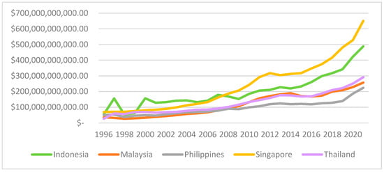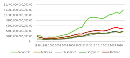 Politicians and economists in the ASEAN region have been debating the issue of public debt, with opposing viewpoints offered by Hajian et al. [8]. Past studies on the factors that affect public debt have shown conflicting findings, particularly when it comes to the influence of economic growth [9]. According to certain studies, economic growth is essential for lowering national debt [10,11,12]. The justification for this is that as the economy expands, the government might be able to raise taxes and produce more money to pay down its debt. Moreover, stronger economic development might boost investor confidence, which would lower the government’s borrowing cost and ultimately result in lower public debt. Yet, other research contends that increased economic development may increase governmental debt [13]. Government spending may increase to support the economy during periods of economic growth, which could result in a greater budget deficit and, ultimately, a rise in the national debt. Governments may also raise their debt levels to fund infrastructure and other investment initiatives to promote economic growth. The ASEAN-5 nations have put the ASEAN Economic Community (AEC) policy into practice to promote economic progress. This policy aims to promote greater regional trade in commodities, services, investments, and other areas. Due to the upward trend in economic growth in the ASEAN-5 nations, their public debt is at risk of rising.
