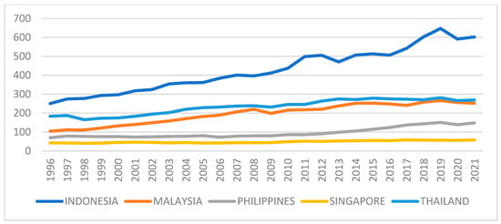Figure 2 depicts the ASEAN-5 nations’ economic growth from 1996 through 2021, with a general upward trend. Particularly during the 1997–1998 economic crisis, these nations struggled to achieve economic development. The global financial crisis and the COVID-19 pandemic were blamed for the region’s worrisome decrease in GDP and subsequent recessions in 2009 and 2020, respectively. In conclusion, many factors affect the direction of the complex relationship between public debt and economic development. To prevent a rise in public debt that could harm the economies of the ASEAN-5 nations, continuous attempts to spur economic growth must be closely monitored.