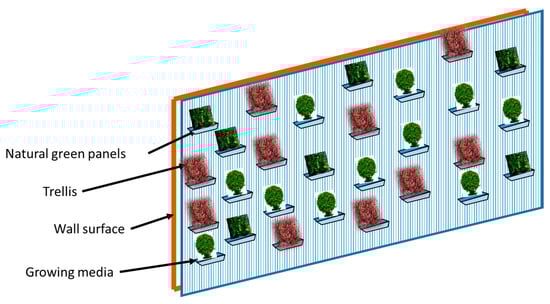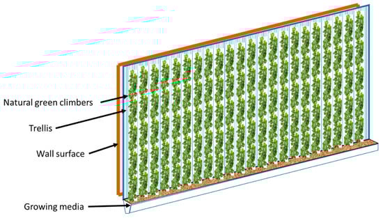 Living walls and green façades are the two main types of green walls. A living wall consists of panels attached to an internal or external vertical structure (Figure 3), whereas a green façade is a system in which a natural climber plant is grown on the exterior of a building with the help of an auxiliary framework (Figure 4) []. The panels are ideal for growing upholstery plants. A green façade is a wall that has been grown over by plants that either climb or cascade over the wall. Initially, the constructors had climbing plants attach themselves directly to the walls []. However, green façade practices nowadays have shifted toward constructing structural frames and enabling plants to climb them rather than planting them directly on the walls because of the concern that the root systems of the climbers could potentially cause damage. Plants can be established anywhere from the foundations to intermediate planters to the roofs of buildings. Within a short period of time, these plants completely colonize the walls, changing them into lush, verdant green walls [].