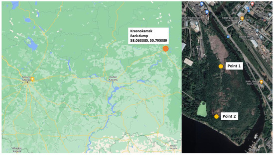 The object of study was BWW excavated at an old bark dump near a pulp and paper mill located in the city of Krasnokamsk, in the region of Perm, Russia (Figure 1). More than 1 million tons of waste generated during the debarking process were disposed of at the dump between 1936 and 2005. The total area of the old bark dump is 22.3 ha. The height of the dump varies from 2 to 21 m.