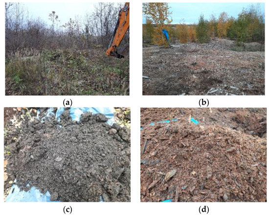 BWW sampling was carried out from two points (Figure 2a,b) using a bucket excavator with an excavation depth of up to 4 m. When choosing the BWW sampling points, the goal was to collect wastes that characterized various lengths of time spent in the body of the bark dump.
