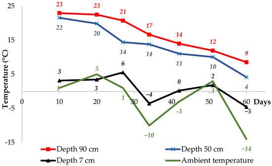 Since the decomposition of organic substances by microorganisms releases thermal energy and heats up the compost mixture [19,41], an increase in the temperature of the compost heap is a clear sign of an active composting process. The opposite is also true in that a decrease in the temperature of the heap is a sign of attenuation in the composting process [42,43,44]. During the field experiment, the temperature of the compost mixture was measured at three points on each heap using a one-meter multi-zone thermal rod TSHM-A/B, at depths of 7, 50, and 90 cm.