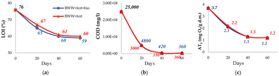In the process of composting using biodegradation, the content of solid organic substances decreases, and that of mineral residues increases accordingly [55]. The index of LOI was used to estimate the content of organic solids in the compost mixture. LOI was determined gravimetrically by ignition at 550 °C for 3.5 h with an open crucible, similar to the method described in ASTM-D7348 [57].