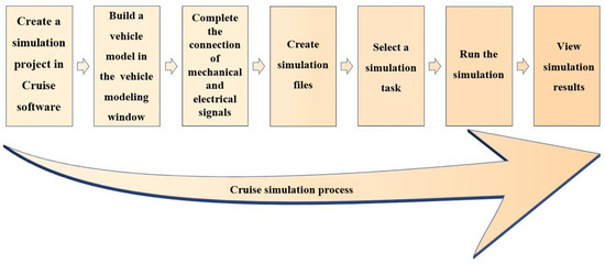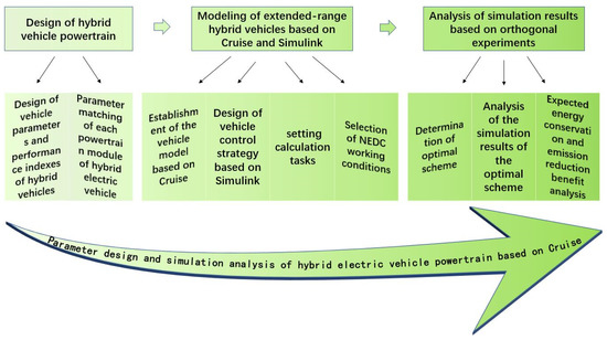 In this paper, by utilizing Cruise software version 2021, firstly, combined with the vehicle information and simulation requirements provided by Corun CHS Technology Co., Ltd. (Foshan, China), the design of the hybrid electric vehicle powertrain is modeled and each performance is simulated; secondly, Cruise software version 2021 simulation analysis can be performed to better utilize the software to automatically optimize the dynamic system components that meet the required parameters, thus reducing the workload and error rate of powertrain parameter matching; thirdly, through simulation analysis and comparison, the rationality of the parameters of the powertrain is judged, which provides a basis for the design and optimization of the vehicle powertrain; finally, the feasibility of the optimized design scheme and results is verified. Through this simulation experiment, a certain amount of work can be reduced for Corun CHS Technology Co., Ltd. in powertrain matching and performance optimization. The overall structure of this paper is shown in Figure 1.