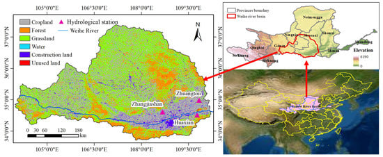 The Weihe River belongs to the largest tributary of the Yellow River, with a total length of 818 km and a total basin area of about 1.35 × 105 km2 (103°05′–110°05′ E, 33°50′–37°05′ N) [17]. The WRB spans 84 counties in Shaanxi Province, Gansu Province, and Ningxia Hui Autonomous Region, of which the Shaanxi, Gansu, and Ningxia sections account for 49.8%, 44.1%, and 6.1%, respectively (Figure 1). There are many geomorphic types in the basin, including the North Shaanxi, Longdong Eastern Loess Plateau, Qinling Mountains, and Weihe Valley. The region has a continental monsoon climate with an average annual precipitation of 500 to 800 mm and an average annual temperature of 7.8 to 13.5 °C [21]. The WRB is not only an essential strategic highland in the economic field in the western region of China but also a major industrial, agricultural, and energy base in China; it is also the location of an equally important transportation hub in the western region of China. However, due to its long history of indiscriminate logging, the ecology of the watershed has been damaged, resulting in the Weihe River becoming an important source of sediment for the Yellow River [23].