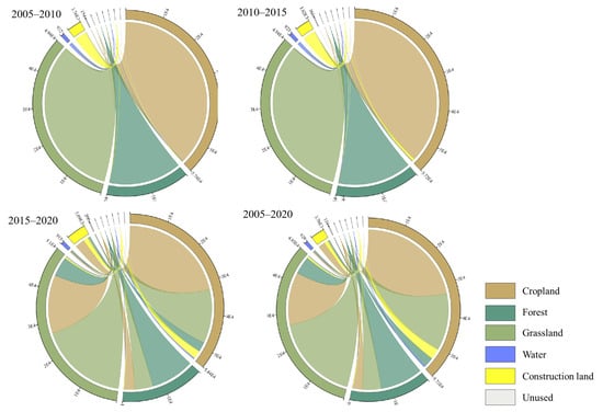 Chord chart of changes in different land-use types in the WRB from 2005 to 2020.