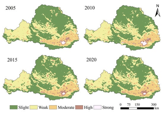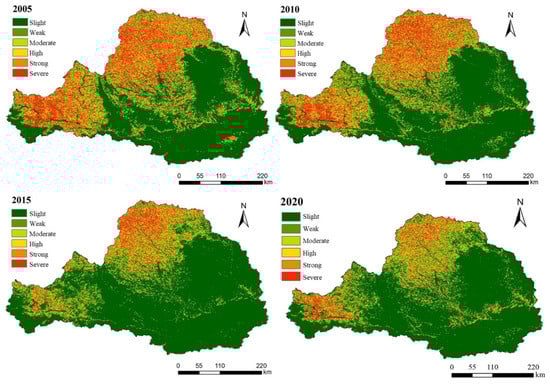 Figure 3 reveals that there was significant spatial variation in soil erosion from 2005 to 2020. The distribution of severe eroded areas was relatively stable, mostly with high and steep terrain and poor vegetation coverage, resulting in serious erosion and requiring focused targeted treatment. The areas with strong erosion were mainly distributed in the northern and western parts of the WRB, and the area gradually decreased with time changes. Areas of high erosion mostly existed around areas of strong erosion. Some areas of high erosion also existed in the central part from 2005 to 2010, and areas of high erosion showed a trend of conversion to moderate and slight erosion from 2010 to 2015.