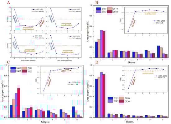 The change degree of the stability rate of soil erosion intensity in different years and the change intensity of soil erosion in each province are shown in Figure 4. It can be seen from Figure 4A that the stability rate of weak, moderate, high, and strong erosion in the WRB is relatively low as a whole. The stability rate of severe erosion is only higher than 50% in the period of 2005–2010, and the stability rate of severe erosion is lower than 30% during the period of 2010–2020, which indicates a significant decreasing trend of soil erosion intensity. The WRB is composed of three sections: Gansu section, Ningxia section, and Shaanxi section. The conversion rates (CVR) of weak, moderate, strong, and severe in all three sections from 2005 to 2020 were above 80%, proving that soil erosion showed a decreasing trend (Figure 4B–D).
