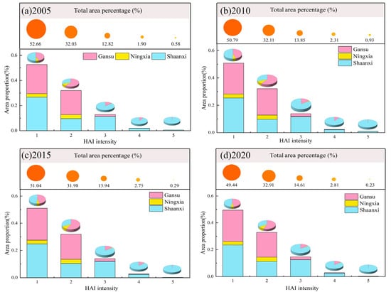 The natural breakpoint method of ArcGIS 10.3 was used to classify the HAI into five levels: slight, weak, moderate, high, and strong. During the period of 2005–2020, the distribution of HAI in the WRB did not change significantly, showing a spatially strong southeastern and weak northwestern feature (Figure 5). As shown in Figure 6a, there is considerable spatial variation in the HAI levels in the WRB, taking the HAI level in 2005 as an example. The slight HAI occupied 52.66%, of which the Shaanxi section accounted for the most (26.66%), followed by the Gansu section (23.17%); the Ningxia section accounted for the least (2.83%). The proportion of the three sections in the weak HAI changed, with the proportion of the Gansu section accounting for 60.32% of the entire weak HAI, the Shaanxi section accounting for 29.81%, and the Ningxia section accounting for 9.89%. The proportion of the Ningxia section in moderate HAI was very small at 0.56%, and the proportion of the Shaanxi section returned to the first position with 86.85%. The proportion of the Gansu section was 12.58%. The HAI in the Ningxia section of the WRB contained only weak, mild, and moderate HAI. The high level of HAI accounted for 1.90% of the whole basin, of which the Shaanxi section had an absolute advantage with 91.80%, followed by the Gansu section with 8.44%. The strong HAI in the WRB had a very small percentage of 0.58%, of which the Shaanxi section accounted for 98.93%. In terms of changes in different HAI levels from 2005 to 2020, the slight and weak HAIs covered most of the study area, mainly in the northern and western parts of the WRB, accounting for more than 80% of the total basin, as shown in Figure 5. The Ningxia section was basically in the stage of weak HAI. The high and strong areas were mainly distributed in the Shaanxi section of the WRB, accounting for 3% of the total basin. The degree of slight HAI decreased significantly, from 52.66% in 2005 to 49.44% in 2020. The area percentage of weak and moderate HAI showed an increasing trend, with the percentage of weak HAI increasing from 32.03% in 2005 to 32.90% in 2020 and the percentage of moderate HAI increasing from 12.82% in 2005 to 14.61% in 2020. The percentages of high and strong HAI increased by 47.56% and decreased by 60.55%, respectively. In general, most of the regions were characterized by slight and weak HAI during the period of 2005–2020; the changes were not very significant, and the high and strong HAI was mainly concentrated in the Shaanxi section of the WRB.