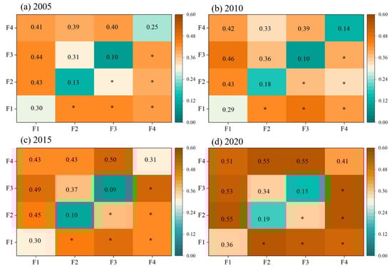 Variable correlation and interaction between 2005 and 2020 ((a) Driver correlations in 2005, (b) Driver correlations in 2010, (c) Driver correlations in 2015, (d) Driver correlations in 2020. Note: * represents p less than 0.05, F1 represents POP, F2 represents PANDA, F3 represents crop, and F4 represents GDP).