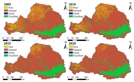 From 2015 to 2020, the QFSI with the poor, general, good, and excellent coupling degrees were −0.189, 0.023, 0.517, and 0.236, respectively (Table 5). Compared with 2010–2015, the area with the good, general, and excellent coupling degrees is increasing in varying degrees, indicating a steady increase in the effectiveness of ecological management in the WRB.
