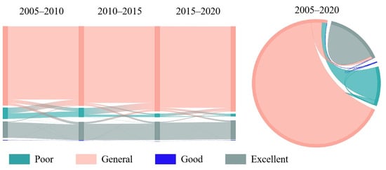 Figure 9 illustrates the dynamics of the degree of coupling for different periods (2005–2010, 2010–2015, 2015–2020, and 2005–2020). From 2000 to 2010, the QFSI with the poor, general, good, and excellent coupling degrees were −0.228, 0.024, −0.075, and 0.536, respectively (Table 5). The outflow with a degree of coupling of poor is greater than the inflow, and its area tends to decrease, mainly shifting to the general coupling. The inflows are greater than the outflows in the excellent coupling degree, and their areas have a tendency to increase. The QFSI with good and general coupling degrees is close to 0, indicating that the change is not significant and is close to the equilibrium state of bidirectional conversion.