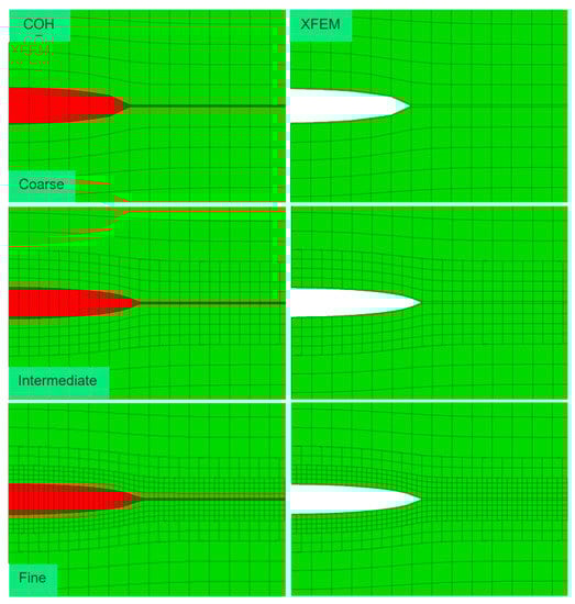 In Abaqus software, the models are set up with appropriate geometry and meshing to accurately represent the problem. The 2D plane strain model uses a structured mesh with quadrilateral elements, while the 2D model employs hexahedral elements, as shown in Figure 5. Both meshes are refined near the fracture to capture the gradients and fracture behavior more accurately. The mesh density is adjusted to ensure convergence and minimize computational time [].