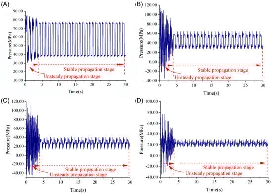 An advanced hydraulic fracturing technique: Pressure propagation and attenuation mechanism of step rectangular pulse hydraulic fracturing. ABCD indicate different distances from the boreholes for various locations in shale reservoirs (A) 5 m, (B) 5 m, (C) 100 m, (D) 100 m.
