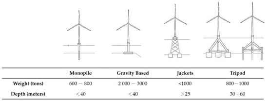 - Sánchez, S.; López-Gutiérrez, J.-S.; Negro, V.; Esteban, M.D. Foundations in Offshore Wind Farms: Evolution, Characteristics and Range of Use. Analysis of Main Dimensional Parameters in Monopile Foundations. J. Mar. Sci. Eng. 2019, 7, 441. [Google Scholar] [CrossRef]