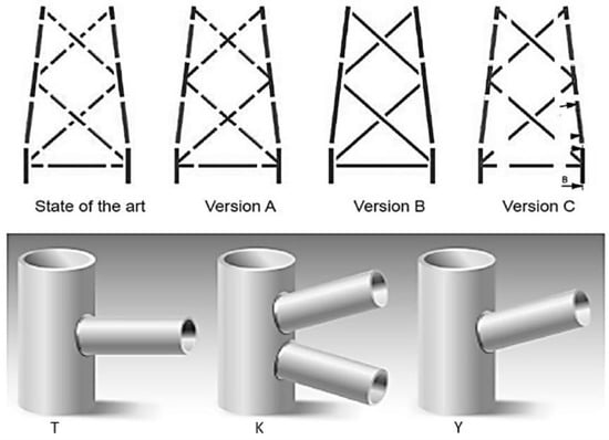 The main types of underwater foundations in Taiwan are the monopile and jacket foundations. Monopile foundations are commonly used in seabeds composed of gravel, sand, or clay. The wind turbine tower is connected to the monopile underwater structure through flanges or grout joints, allowing the transfer of the load from the wind turbine system to the supporting seabed foundation. Monopile foundations are typically applied in water depths ranging from 20 to 25 m. They offer advantages such as simplicity in structure, ease of manufacturing, and low development costs. This type of foundation is widely used in offshore wind farms in Europe. Jacket foundations, on the other hand, feature a more complex structure. They consist of a steel truss system formed by the interconnection of four chord members with additional bracing members. The structural components of jacket foundations are primarily steel pipes. The fabrication process involves intricate machining of the pipe openings, which requires the creation of beveled edges. The joint types at the nodes predominantly include T-shaped, Y-shaped, K-shaped, X-shaped, and saddle-shaped configurations, as shown in Figure 2. The design of the nodes is complex, involving multiple directions. Moreover, the welds in the node pipes must undergo 100% non-destructive testing and meet the required standards. Therefore, the manufacturing of jacket foundations poses challenges to the fabricators in terms of welding process planning and the expertise and proficiency of welding personnel [].