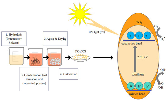 TiO2 was directly precipitated onto XG using the sol–gel dip-coating process (TiO2/XG). First, 30 mL of the TTIP solution, 3.5 mL of the acetic acid, and 5 mL of the distilled water were stirred for 60 min. To this was added 0.2 gm of XG, and a shaker incubator was used to stir the mixture for 30 min at 350 rpm. Finally, the coated XG was dried in an oven at 50 °C for 30 min. The sample synthesis was then gathered and placed in a muffle furnace at 200 °C for 2 h for calcination. Lastly, it was completely cleansed with distilled water and dried for 30 min in a hot air oven at 50 °C [25]. A second coating cycle was then used to increase the thickness of the immobilized TiO2 film (Figure 2). The TiO2/XG was then washed with distilled water to eliminate any remaining disconnected TiO2 particles, and the material was then saved for later usage.