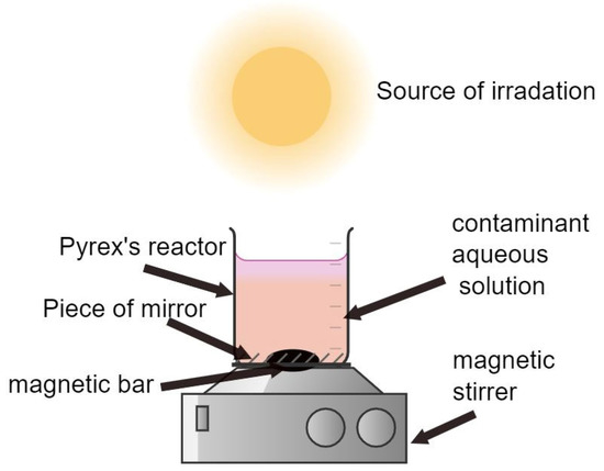 In a batch-mode reactor, two types of dye (RR and RT) were used to evaluate the process of adsorption and the photocatalytic characteristics of the produced materials (Figure 3). The reactor was made of Pyrex glass (1 L) and had a mirror at the bottom that served as a reflector [27]. The solutions were exposed to direct solar radiation between 11 a.m. and 3 p.m. on consecutive sunny days in June and July 2022. Solar radiation was measured using an SPM-1116SD (LUTRON ELECTRONIC, Coopersburg, PA, USA), whereby the device was directed toward the sun to measure the solar radiation reaching the reactor. UV measurements were obtained for the range between 300 and 400 nm, with an average solar UV power of 150–850 W/m2. Different concentrations of the dye solutions were prepared and adjusted to the desired pH using a dilute solution of 0.1 M HCl or NaOH (employing a pH meter model INOLAB 72, WTW Co., Weilheim, Germany). After that, the TiO2/XG nanoparticles were added to the solution at the desired concentrations (15, 25, 50, and 75) mg/L. The suspension was agitated at 200 rpm (type MSH-300N, BOECO, Hamburg, Germany). The solution was kept in the dark under stirring for 30 min in order to reach the primary adsorption equilibrium between the dyes and the TiO2/XG nanocomposite [28]. Consequently, the solutions were exposed to sunlight under constant stirring; H2O2 in various amounts (200, 400, and 600 mg/L) was added to start the reaction. Thereafter, 10 mL was regularly extracted and centrifuged at 200 rpm for 15 min to obtain the catalyst. The dye concentrations in the respective samples were assessed using a spectrophotometer (UV–Vis Spectrophotometer Perkin-Elmer 55 OSE) with a maximum of 540 and 665 nm for the RR and RT dyes, respectively. Finally, the percentage of dye elimination was estimated using Equation (2):