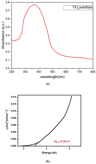The optical absorption of the nanoparticles sample was observed in the UV–Visible spectrum taken by UV–vis spectrometer (UV–Vis Spectrophotometer Perkin-Elmer 55, Waltham, MA, USA). The spectrum was recorded in the wavelength range of 200–600 nm. The optical band gap was measured using a UV–Vis spectrometer (UV-1800, SHIMADZU, Kyoto, Japan) to assess the TiO2/XG nanocomposite’s semiconductor nature. Subsequently, Tauc’s plot double beam equation (Equation (1)) was used to estimate the band gap as appropriate for 200–800 nm wavelengths [26].