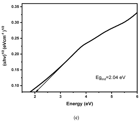 The band gap energy for TiO2/XG. (a) Absorption spectra for TiO2/XG nanoparticles, (b) direct band gap, (c) indirect band gap.