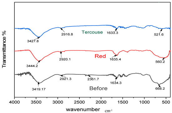 After dye degradation (red and blue curves for the solution of RR and RT dye in Figure 3, respectively), the intensity of some peaks shifted to new values due to the reaction between the dye molecules and the catalyst active groups [34]. Thus, there was a change in the peak intensity at 3419.7 cm−1 compared to 3444.2 and 3427.8 cm−1, which resulted from the interaction between the dyes with the -OH groups of XG in the TiO2/XG nanocomposite, and at 2921.3 cm−1 compared to 2920.1 and 2916.8 cm−1, due to interaction between the groups in dyes with titanium carboxylate in addition to the peaks at 1634.3 cm−1 compared to 1635.4 to 1633.3 cm−1, shifting the peak at 668.2 cm−1 to 560.2 and 521.6 cm−1 for the RR and RT dyes, respectively. In addition, the results shown in this figure present the absence of the peak at 2381.7 cm−1.