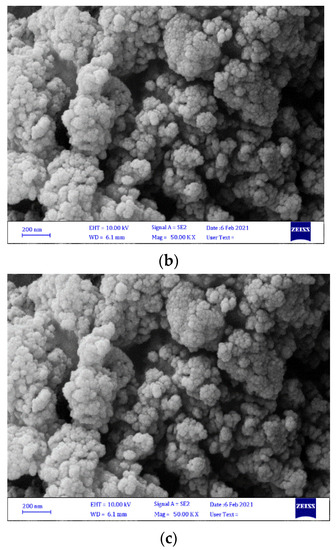The various functional groups present on the surface of the TiO2 sample were identified from the Fourier-transform infrared (FTIR) spectrum. The spectrum was recorded over the wavenumber range of 4000–500 cm−1, recorded by an FTIR spectrometer (FT-NIR Spectrometer L1390022, PerkinElmer, Waltham, MA, USA). The topography of the nanoparticles sample was observed from the images taken by an emission scanning electron microscope (SEM TESCAN MIRA3, FRENCH, Fuveau, France). The structural properties, crystallite size, and interplanar spacing between the crystallographic planes of the nanoparticles were determined by X-ray diffraction (XRD) patterns obtained by an X-ray diffractometer (XRD PHILIPS XPERT, HOLLAND, Amsterdam, The Netherlands) and handled by X’Pert HighScore Plus software (version 2.0). The diffraction patterns were recorded in the 2θ range of 10°–80°. The operation voltage was 10 kV.