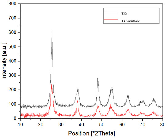 The average crystal size for TiO2/XG was 36.35 nm, calculated using Scherrer’s equation,