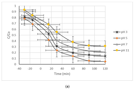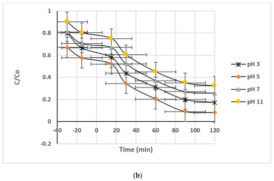The pH value is among the most essential factors influencing the elimination of pollutants due to its effect on the ionization of the pollutant and catalyst in the solution [36]. The results for the RR and RT dye removal efficiency via adsorption (first 30 min) and photodegradation using TiO2/XG at different values of pH (3, 5, 7, and 11) at 25 mg/L of initial dye concentration, 25 mg/L of TiO2/XG, and 400 mg/L of H2O2, are shown in Figure 8. According to the results, a slight degradation was observed in the darkness and increased by increasing irradiation time. This figure also shows that the degradation efficiency increased by increasing the pH value from 3 until it reached 5, then further increase decreased the removal percentage of RR and RT dye, respectively. The highest RR and RT dye removal efficiencies after 30 min were 31 and 42.2%, respectively, at pH 5. At an irradiation time of 120 min, the maximum removal efficiency was achieved at 98% and 92.8% for the RR and RT dyes, respectively. pH level change influenced the ionization degree and superficial charge of the adsorbent as well as the electrostatic interactions of the surface catalyst and the separation of functional groups on the catalyst’s active sites, altering the solution’s chemistry [37].