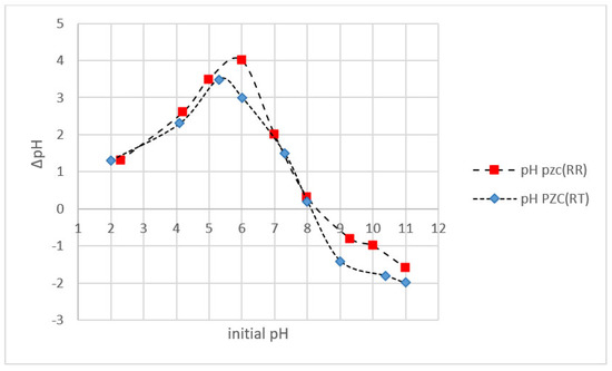 The pH zero-point charge (pHzpc) of TiO2/XG was determined using the method described in Mohseni-Bandpi et al. [39]. This conclusion was important in determining the surface charge of TiO2/XG against the solution, and their results are presented in Figure 9. The graph shows an intersection at 8.1 and 8.3 for the RT and RR dyes, respectively, demonstrating that at this pH level, there is a negative surface above TiO2/XG and a positive surface below.