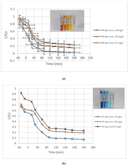 To examine the effectiveness of TiO2/XG for RR and RT dye removal at different initial dye concentrations (25, 50, and 75), experiments were carried out at pH 5, 25 mg/L of TiO2/XG, a H2O2 concentration of 400 mg/L, and a 240 min reaction time. The results are presented in Figure 10. The decolorization efficiency declined as the initial RR and RT dye concentrations increased; this may have been because the dye molecules were increasingly adsorbed onto the surface of TiO2 with the increase in the initial dye concentration. Because there is no direct contact, it is possible that the significant dye adsorption inhibited the interaction between the dye molecules and the hydroxyl radicals or photogenerated holes. With more dye, light is absorbed by the dye molecules, meaning no photons can reach the surface of the photocatalyst, reducing the photocatalytic decolorization efficiency [40]. In addition, prolonging the time by up to 90 min increased the dye degradation, with maximum removal of 94 and 91 for the RR and RT dyes, respectively. The quantity of absorbed photons on the catalyst surface increases as the radiation time increases, promoting the photocatalytic process [41]. Again, increasing the catalyst concentration to an optimum level improved the degradation of the dye. Following that, the elimination percentage decreased. These results are in agreement with the findings of Inamuddin [24].