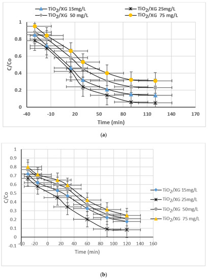 A series of experiments were carried out in which TiO2/XG concentrations (15, 25, 50, and 75) mg/L were varied while the remaining parameters remained constant. As displayed in Figure 11, adsorption data can be seen for reaction times of −30 to 0 min, in line with the 0–30 min adsorption time interval. Meanwhile, the 0–120 reaction time range represents the photodegradation data. Increasing the catalyst concentration from 15 to 25 mg/L led to a further increase in the RR and RT dye adsorption removal and photodegradation removal efficiencies. A further increase in the amount of TiO2/XG nanocomposite above 25 mg/L decreased the degradation rate. Additional TiO2/XG additions did not affect the degradation process and they merely widened the layer formed in the solution [24].