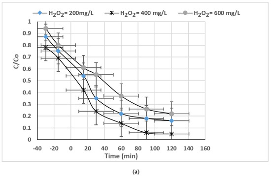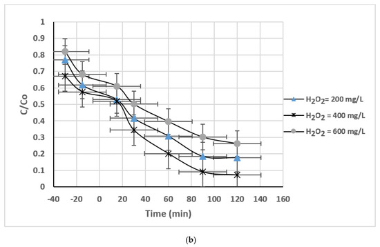 The H2O2 concentration is a significant factor in the degradation of dyes as it is the source of hydroxyl radicals. Figure 12 shows the variation in the RR and RT dye degradation from an aqueous solution at different H2O2 concentrations (200, 400, and 600 mg/L). It can be noticed from this figure that increasing the initial concentration of H2O2 from 200 to 400 mg/L increased the decolorization efficiency from 84 and 82.3% to 92.5 and 90.8% for RR and RT dyes, respectively, in line with Equations (6)–(8). Further increases in H2O2 concentration to 600 mg/L would reduce the decolorization efficiency, whereby high concentrations of H2O2 act as a radical scavenger according to Equations (9) and (10), and HO2• becomes predominant. Reduced concentration of H2O2 reduces the hydroxyl radicals (OH•), leading to insufficient dye consumption and a reduction of the oxidation rate; this was also noted by [42,43].