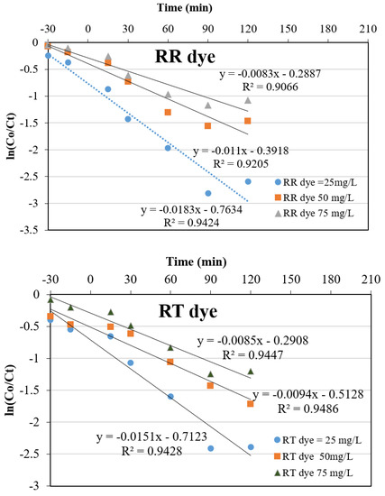 To examine the performance of solar photocatalytic processes for the degradation of RR and RT dyes from aqueous solution, kinetic analysis is essential for understanding the photodegradation process and reaction rate, which depend on the dynamic collaboration of dyes and the nanocomposite surface. A pseudo-first-order kinetics model is often used to show the reaction rate of a heterogeneous catalytic process, which can also be explained via the Langmuir–Hinshelwood (L–H) kinetic model [44,45,46].