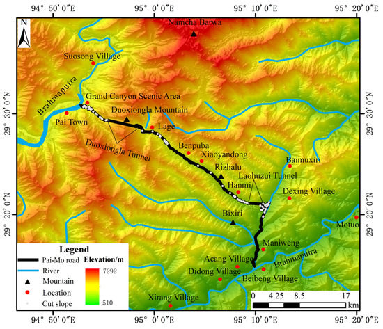The Pai-Mo road is located in Nyingchi City in the south-east of the Tibet Autonomous Region, which belongs to the lower reaches of the Brahmaputra River. The road commences from Pai Town in Nyingchi and traverses the Duoxiongla Mountain via a dedicated tunnel. From there, it meanders along the Duoxiong River Valley, passing through Lage, Hanmi, Laohuzui, and Ani Bridge, and eventually terminating at the Jiefang Bridge of Beibeng Village in Motuo County. The Pai-Mo road passes through the Brahmaputra Grand Canyon National Nature Reserve, with a total length of 67.22 km (Figure 1).
