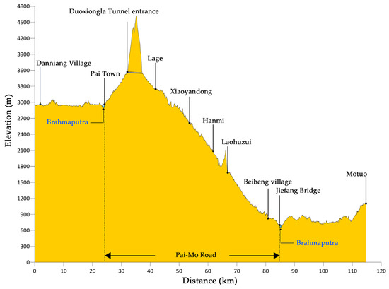 The Duoxiong River basin belongs to the Himalayan eastern tectonic junction area. The area features undulating terrains, deep river valleys, and steep mountains, and is known for experiencing the most significant uplift and erosion from the Tibetan Plateau. The highest elevation of the road is approximately 3654 m, at the entrance to the Duoxiongla Tunnel, and its lowest elevation is about 680 m, at the Jiefang Bridge (Figure 2). Notably, the entrance section of the Pai Town–Duoxiongla Tunnel involves an elevation gain and a road slope drop of 8.8%. The 52.2 km stretch between the Duoxiongla Tunnel exit and the Jiefang Bridge has an altitude difference of 2863 m and a road slope of 54.8‰. The project started in April 2014 and was completed in May 2021. Thus, the route from Nyingchi to Motuo County has been shortened from 352 km through Bomi County to 180 km through Pai Town.