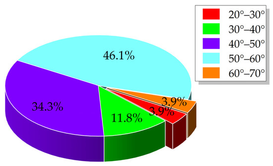 The excavation of these cut slopes has been guided by material composition, cementation degree, and surface slope, with a slope ratio of 1:0.75–1:1.5 (Horizontal:Vertical (H:V)). A 2.0 m wide slope platform has also been established with every 10–12 m ascent. Among these cut slopes, the slopes of 50–60° are the most common, accounting for 46.1% of the total; the number of slopes of 40–50° comes next, comprising 34.2% of the total. Those with slopes of 20–30° and 60–70° are less common, and are likewise distributed less frequently (Figure 3).