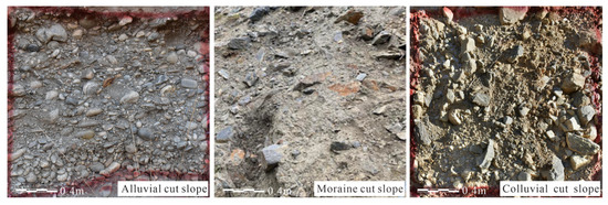 Material composition characteristics of alluvial deposits, moraine deposits, and colluvial deposits cut slopes along the Pai-Mo road.